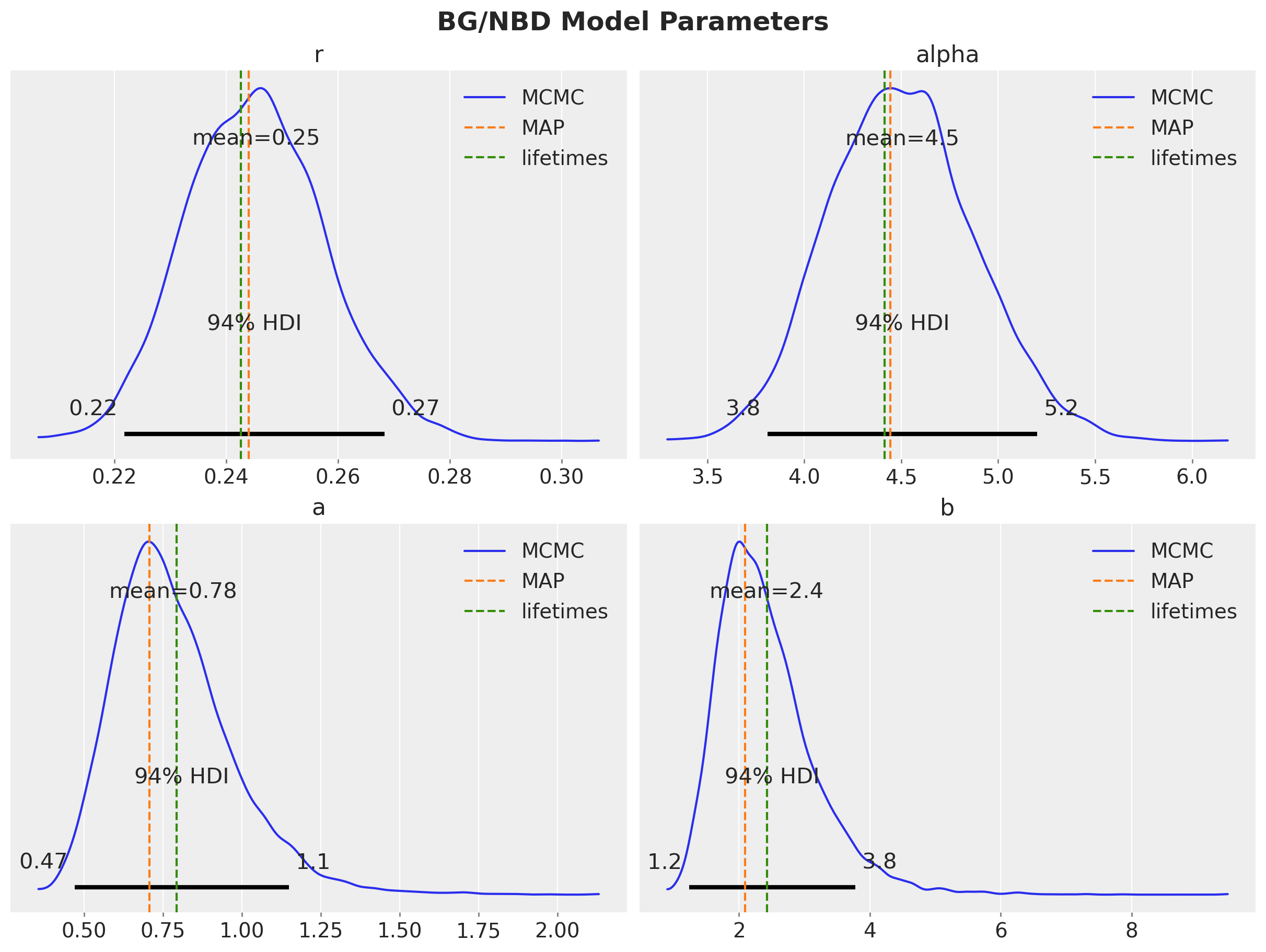 Instead of estimating \(\lambda\) and \(p\) for each specific customer, we do it for a randomly chosen customer, i.e. we work with the expected values of the parameters. Hence, we are interesting in finding the posterior distribution of the parameters \(r\), \(\alpha\), \(a\), and \(b\).