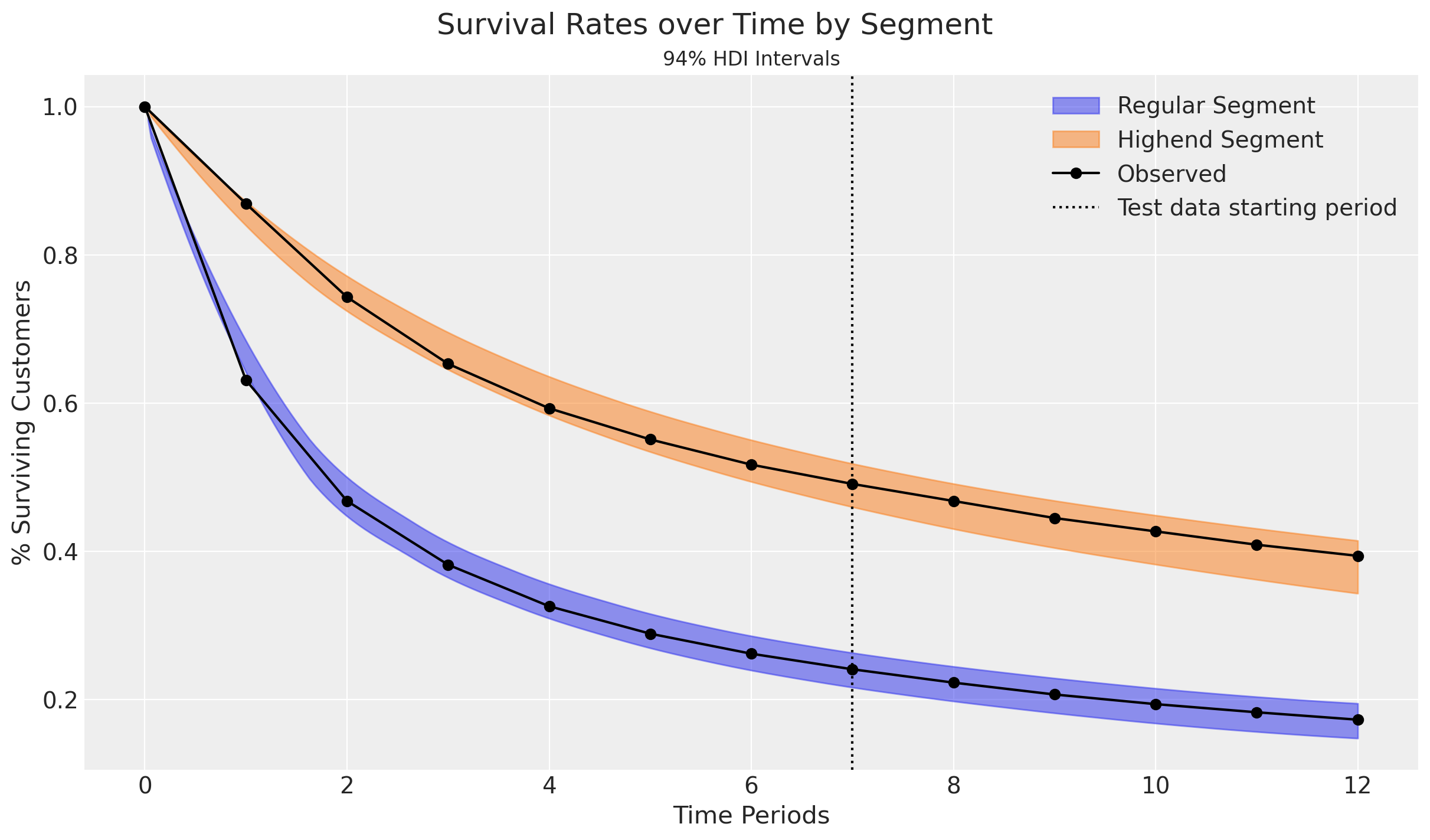 This dataset was generated from the first 8 time periods in Table 1 of the research paper, which provides survival rates for two types of customers (“Regular” and “Highend”) over 13 time periods: